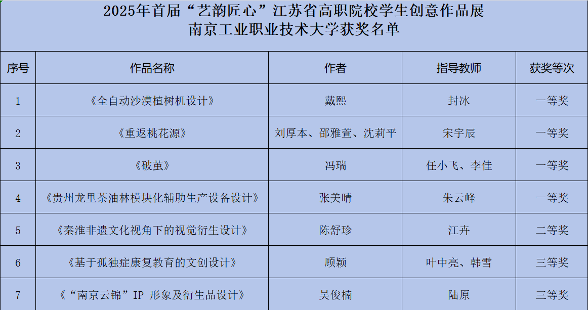 近日,由江苏省教育厅主办的首届“艺韵匠心”江苏省高职院校学生创意作品展圆满落幕。本次大赛共有全省72所高职院校参赛作品447件作品参赛,144件作品实物入围终评展示。我校报送作品获一等奖4项、二等奖1项,三等奖2项,获奖数量与等次均位居全省前列。
