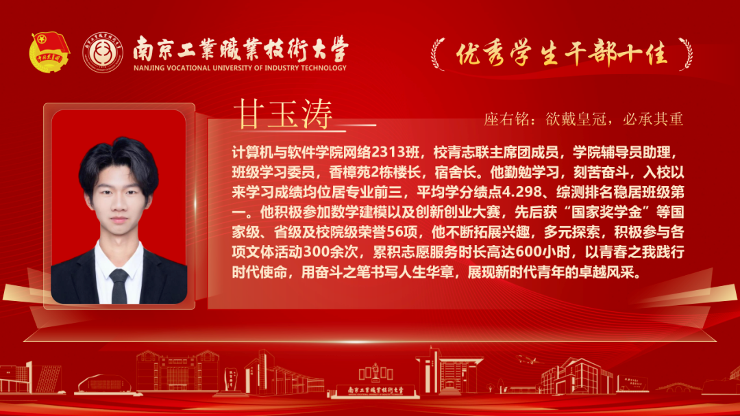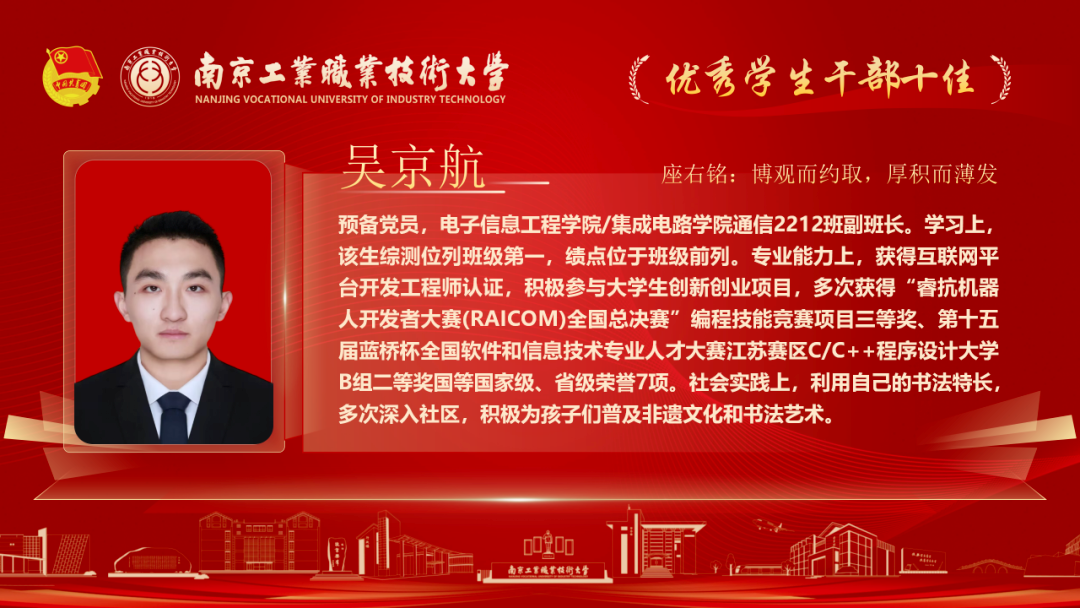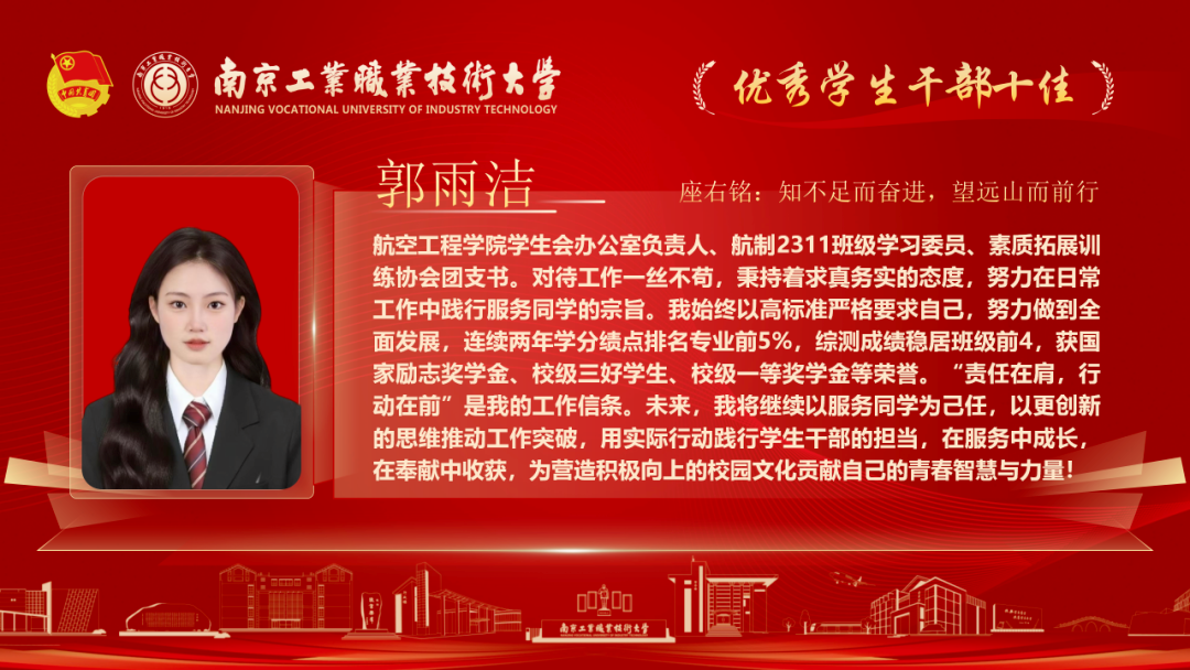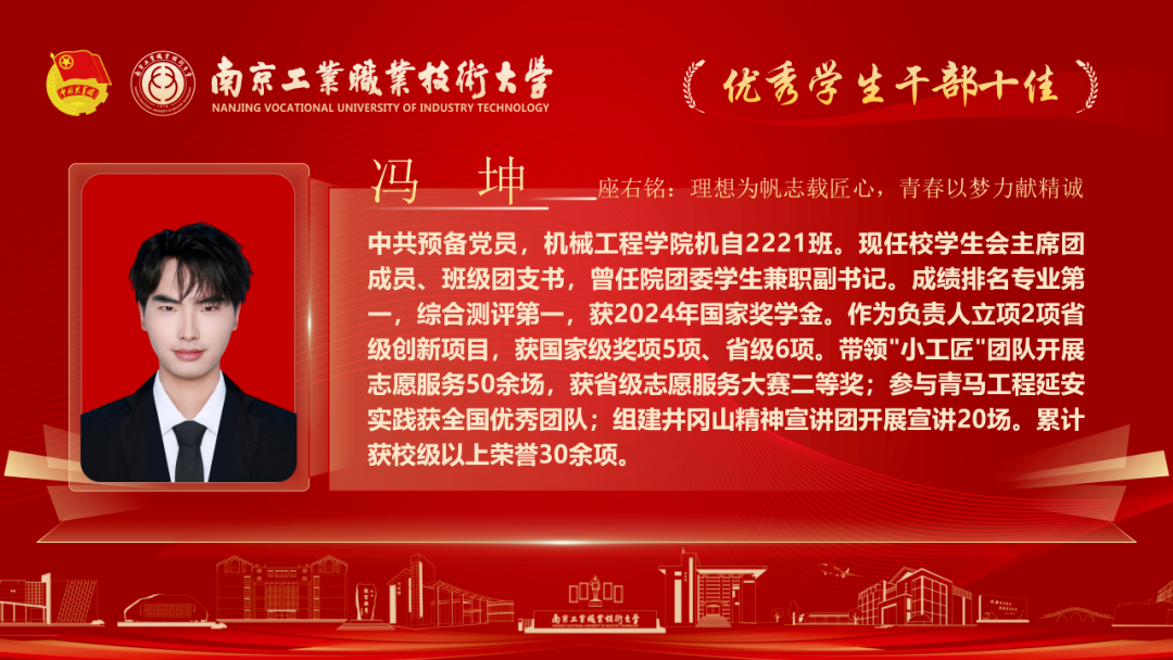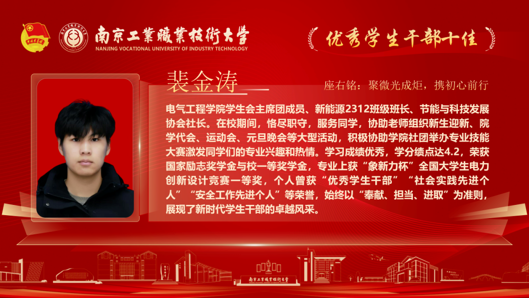 为深入贯彻落实党的二十大和各届全会精神,落实习近平总书记关于青年工作的重要论述,我校各级团组织紧紧围绕学校党政中心工作,持续深化共青团改革,着力保持和增强政治性、先进性、群众性,不断提升团的组织力、引领力、服务力和大局贡献度。在团组织建设、校园文化活动、创新创业教育、社会实践、志愿服务等方面取得了新的成绩,涌现出一批先进集体和优秀个人。本期让我们一起走进2025年南京工业职业技术大学“优秀学生干部”代表,感受榜样的力量!