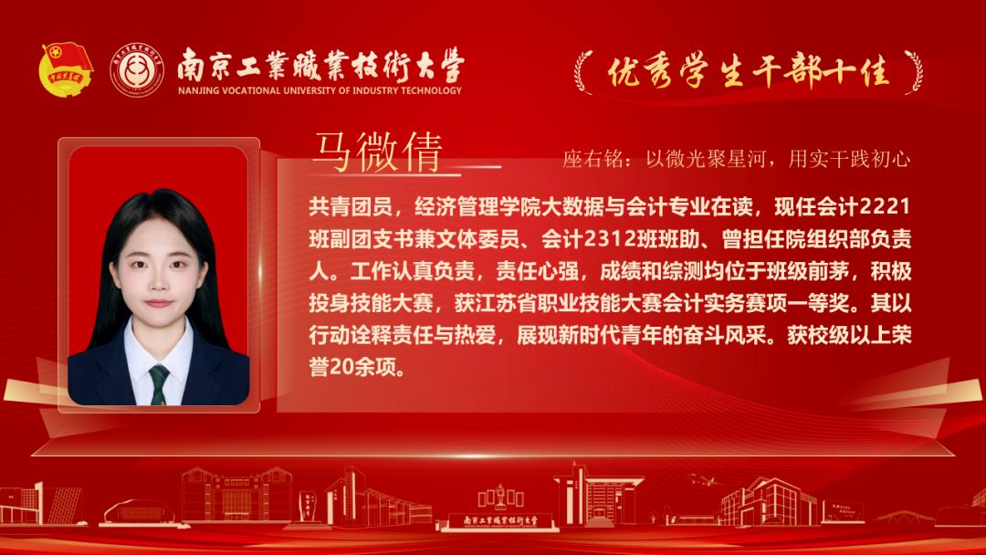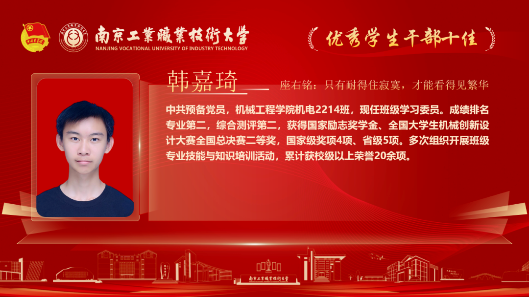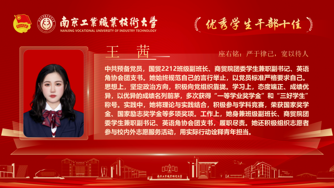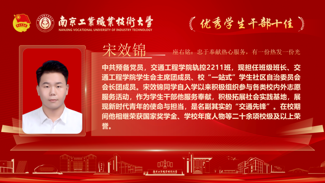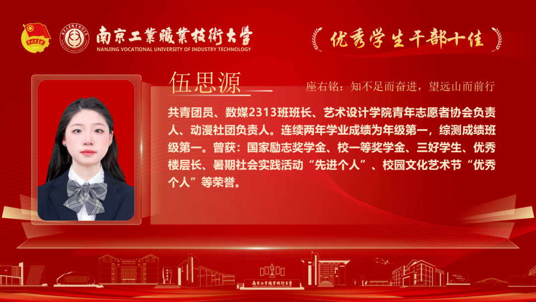 为深入贯彻落实党的二十大和各届全会精神,落实习近平总书记关于青年工作的重要论述,我校各级团组织紧紧围绕学校党政中心工作,持续深化共青团改革,着力保持和增强政治性、先进性、群众性,不断提升团的组织力、引领力、服务力和大局贡献度。在团组织建设、校园文化活动、创新创业教育、社会实践、志愿服务等方面取得了新的成绩,涌现出一批先进集体和优秀个人。本期让我们一起走进2025年南京工业职业技术大学“优秀学生干部”代表,感受榜样的力量!