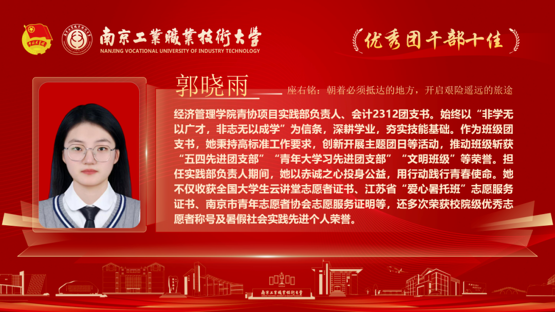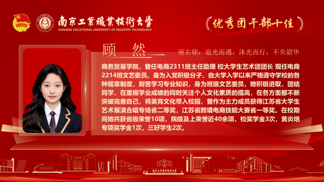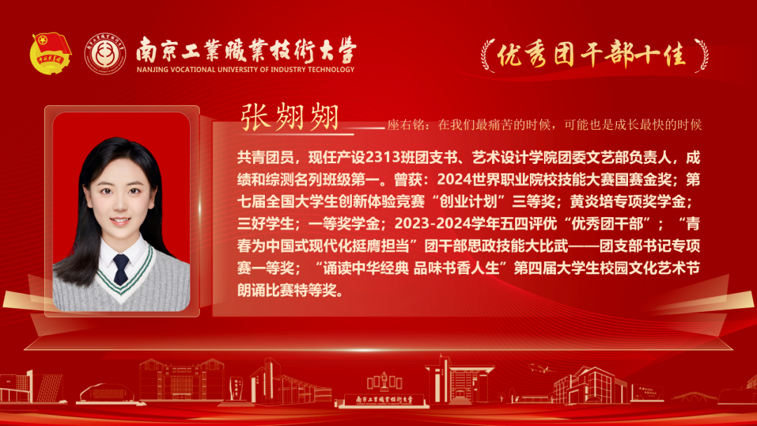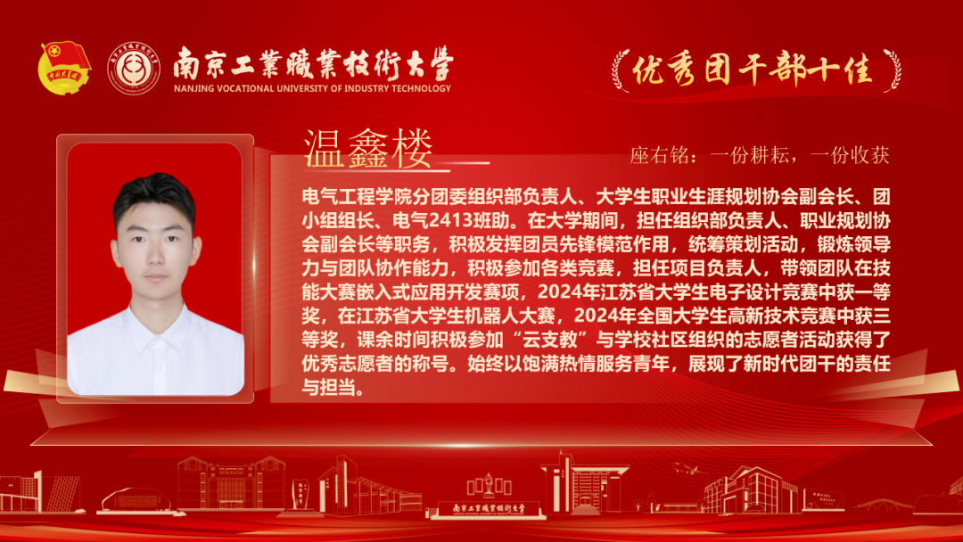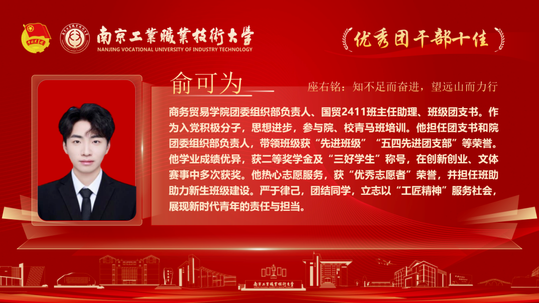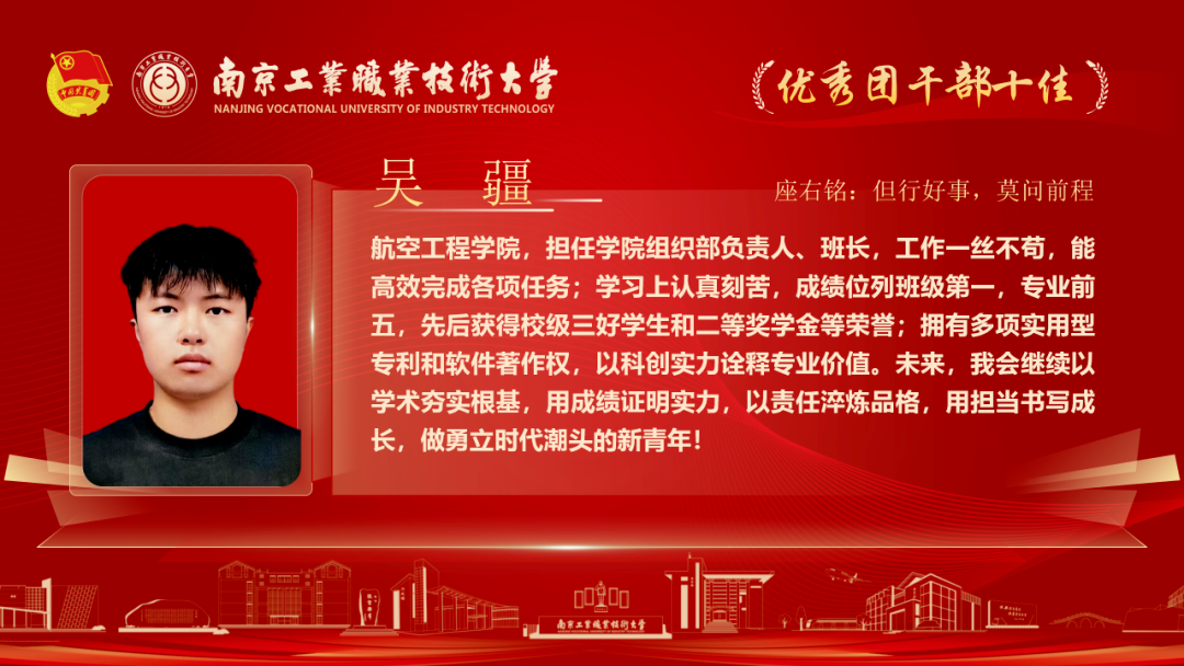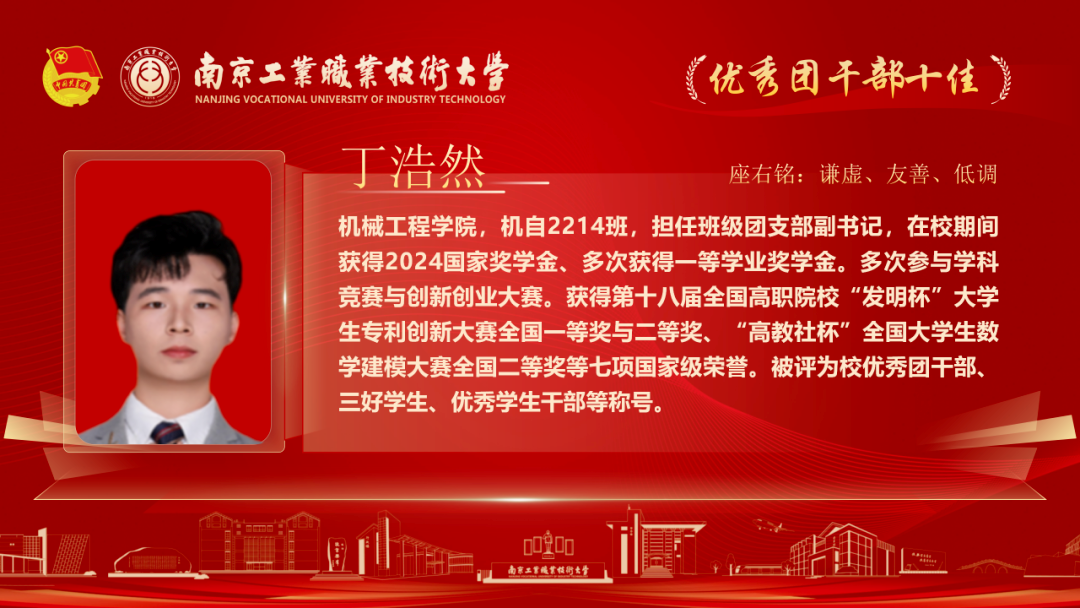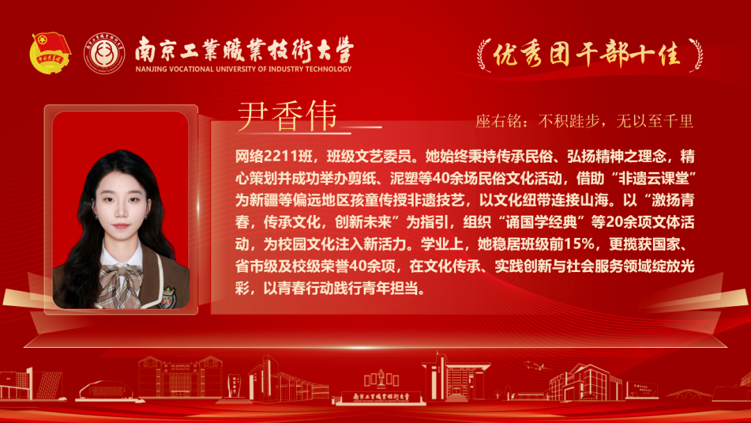 为深入贯彻落实党的二十大和各届全会精神,落实习近平总书记关于青年工作的重要论述,我校各级团组织紧紧围绕学校党政中心工作,持续深化共青团改革,着力保持和增强政治性、先进性、群众性,不断提升团的组织力、引领力、服务力和大局贡献度。在团组织建设、校园文化活动、创新创业教育、社会实践、志愿服务等方面取得了新的成绩,涌现出一批先进集体和优秀个人。本期让我们一起走进2025年南京工业职业技术大学“优秀团干部”代表,感受榜样的力量!