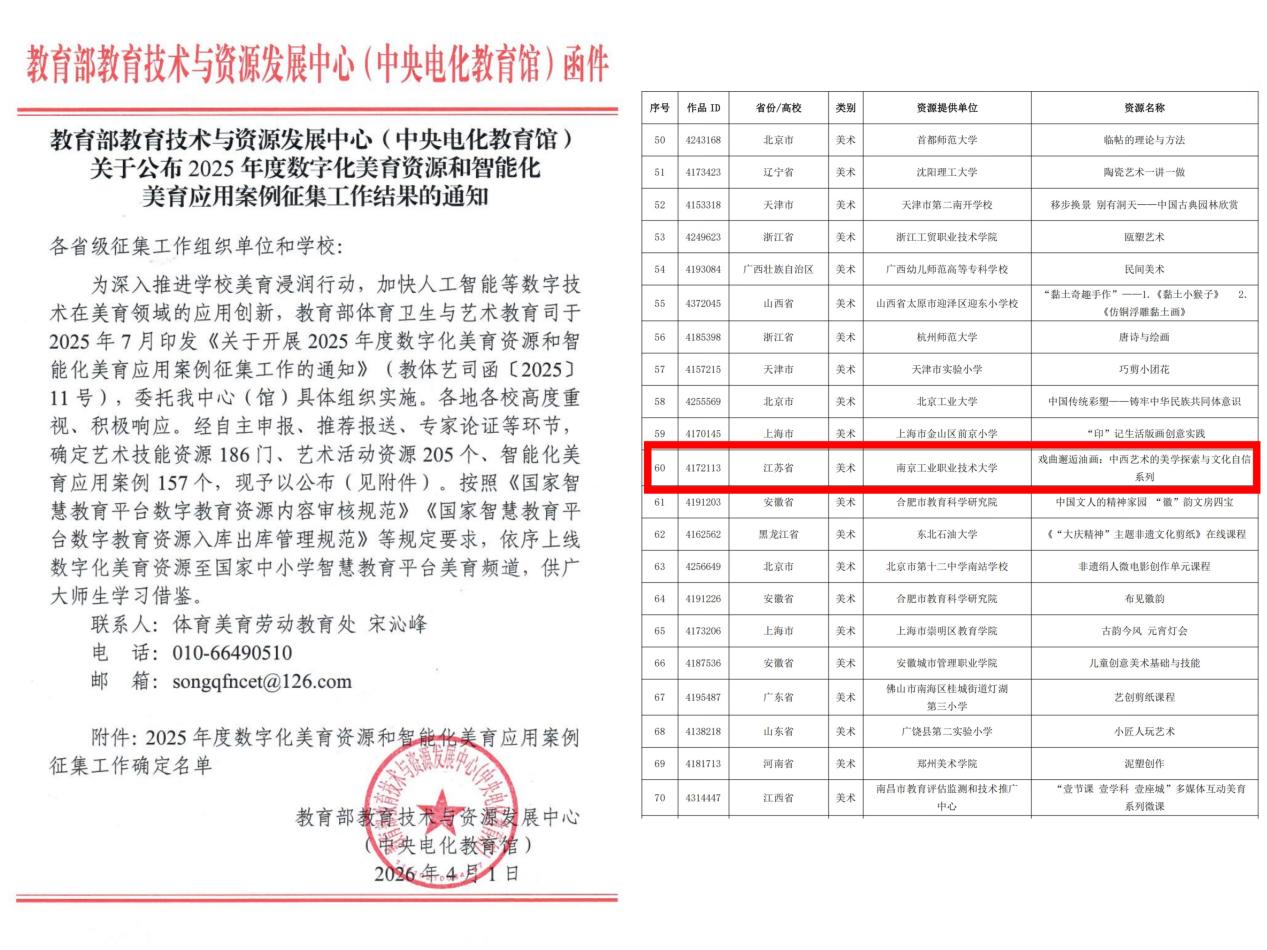 近日,教育部公布2025年度数字化美育资源和智能化美育应用案例征集工作结果,我校艺术设计学院教师殷群老师的艺术技能资源课程《戏曲邂逅油画:中西艺术的美学探索与文化自信系列》成功入选。据悉,全省各级各类学校共30项成果入选,其中9所高校入围。根据《国家智慧教育平台数字教育资源内容审核规范》《国家智慧教育平台数字教育资源入库出库管理规范》等要求,相关数字化美育资源将依序上线国家中小学智慧教育平台美育频道,供广大师生学习借鉴。