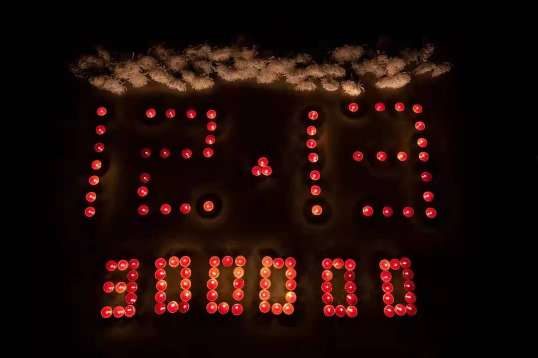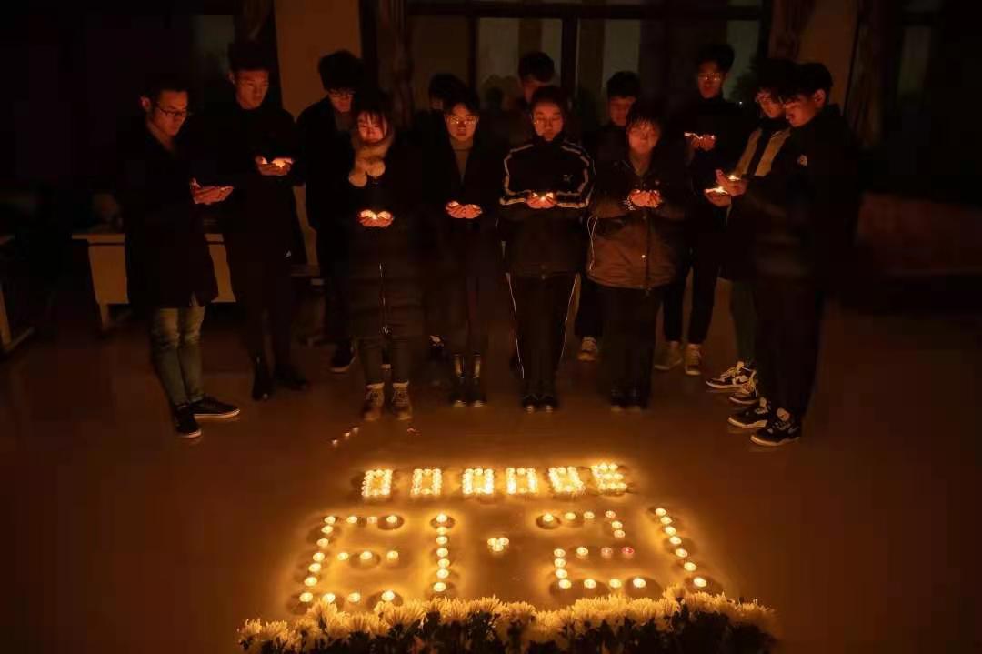 下午六时,83名学生在操场摆出12·13图案,数百名学子集体朗诵《和平宣言》,并自发默哀三分钟。蜡烛点燃 荧荧烛火为故去的同胞送去一份思念 。