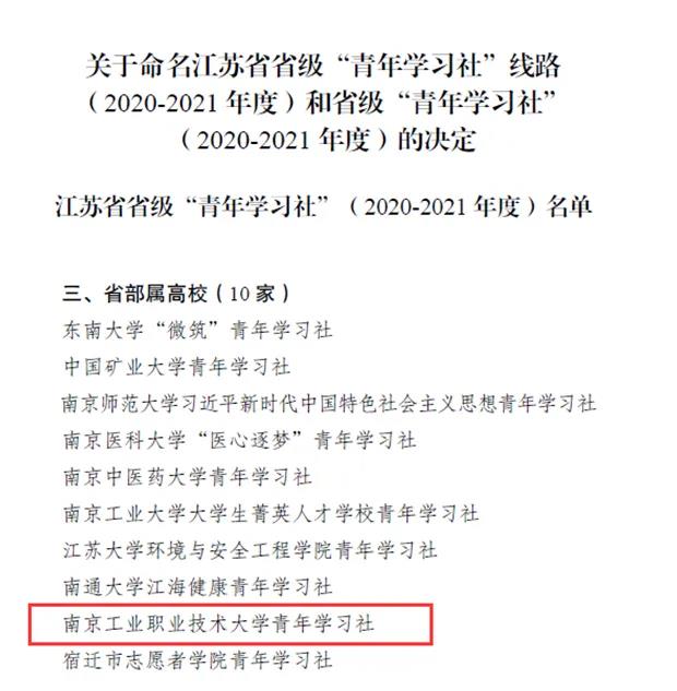 2020年12月23日,共青团江苏省委下发了《关于命名江苏省省级“青年学习社”线路(2020-2021年度)和省级“青年学习社”(2020-2021年度)的决定》 (团苏委发[2020]27号)。我校“青年学习社”经过自主推荐、考察筛选、专家评审、现场答辩最终被命名为江苏省省级“青年学习社”。