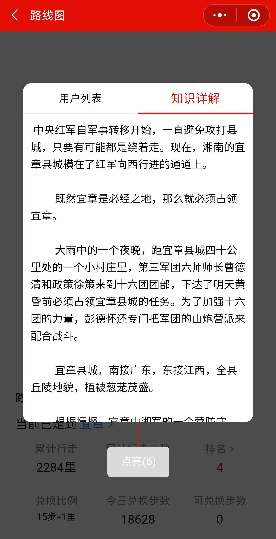 4. 点击地图上已经抵达的地点,打开知识详情翻阅该地红色党史学习卡点亮打卡点,该地点就会被插上一面红旗。注意,如果不点亮地点不算做抵达!