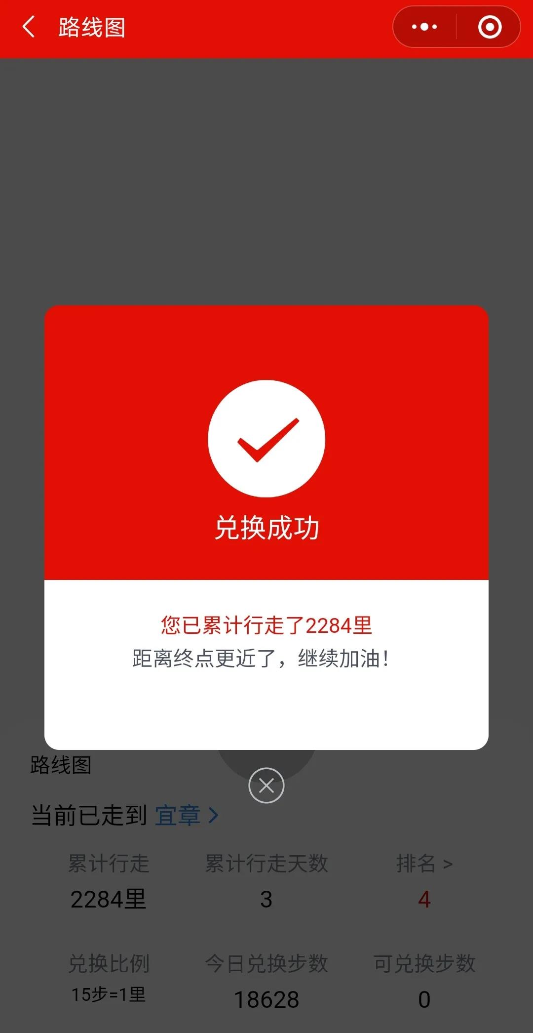 3. 点击兑换里程,兑换今日步数。下方可查看累计行走里程,与排名情况。注意每日零点步数会清空哦,请同学们在步数清空前兑换里程!